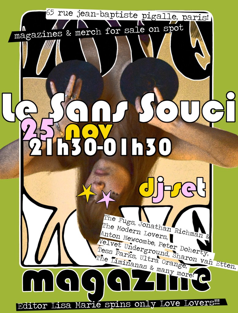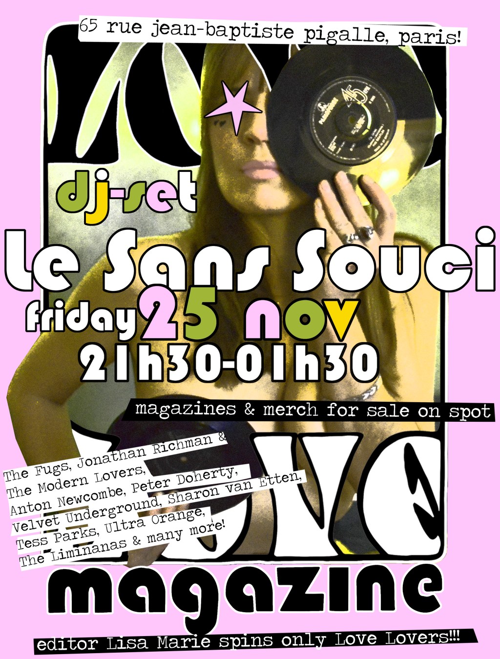 Paris Love Lovers! Le vendredi 25 novembre editor & creator of Love Love, Lisa Marie, is spinning only Love Lovers & artists in other ways attached to the magazine or Love Love TV at Le Sans Souci, Pigalle!