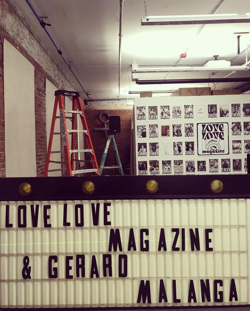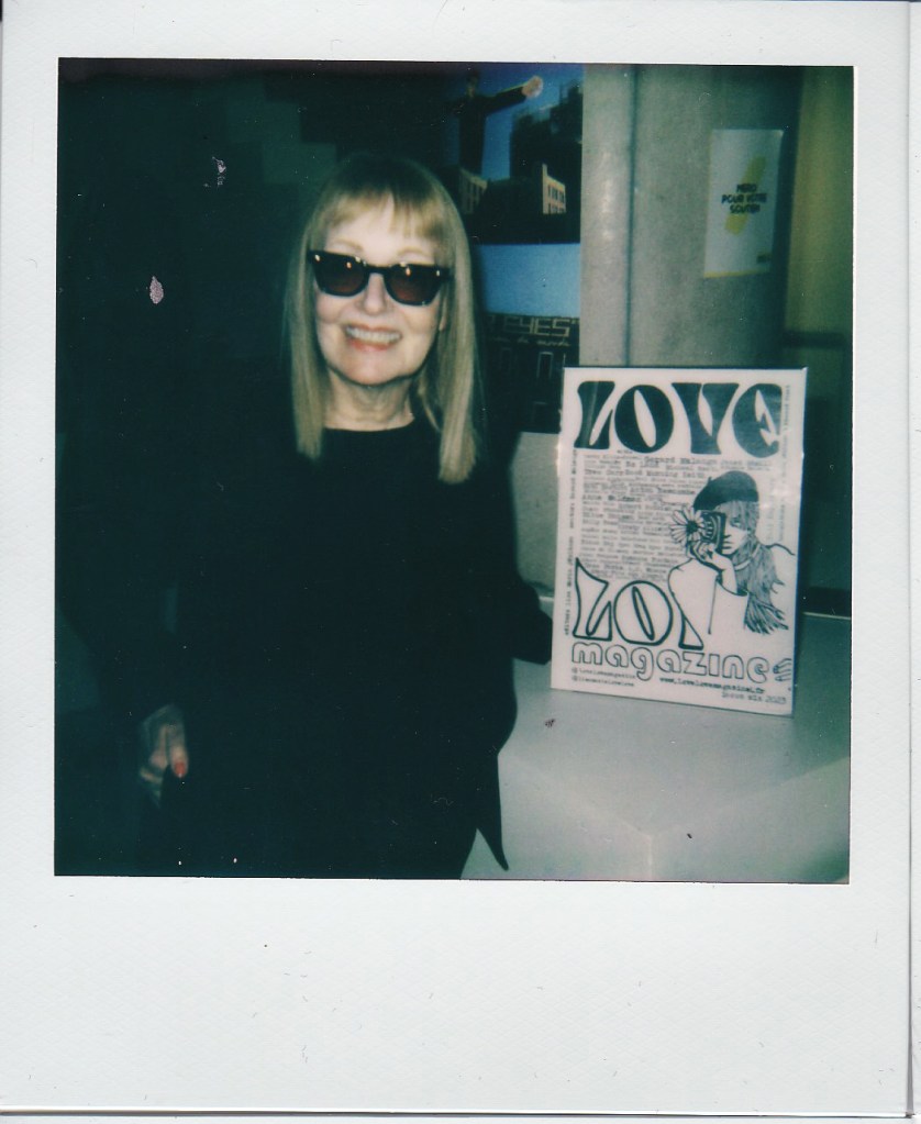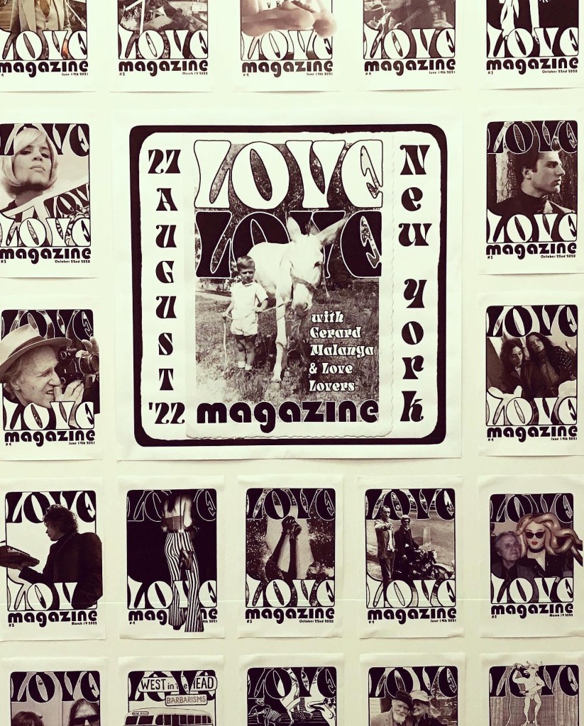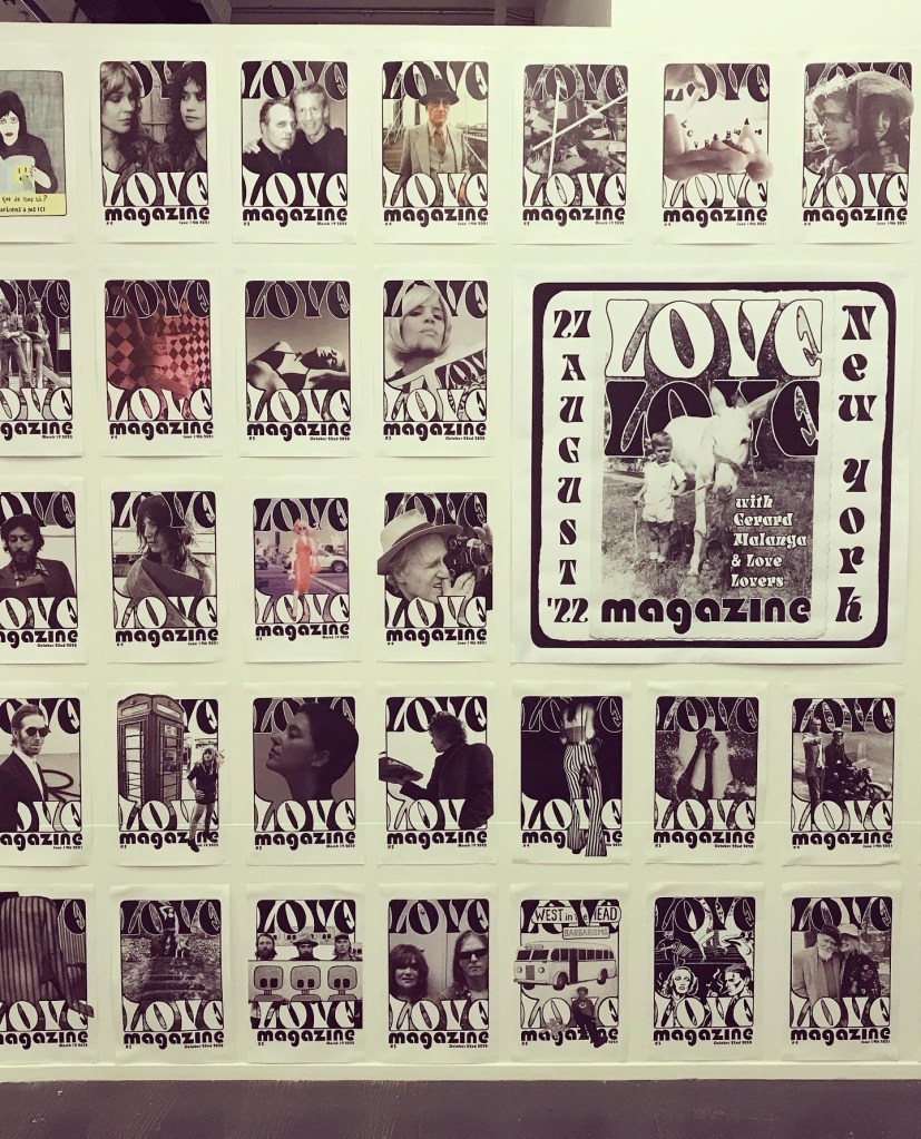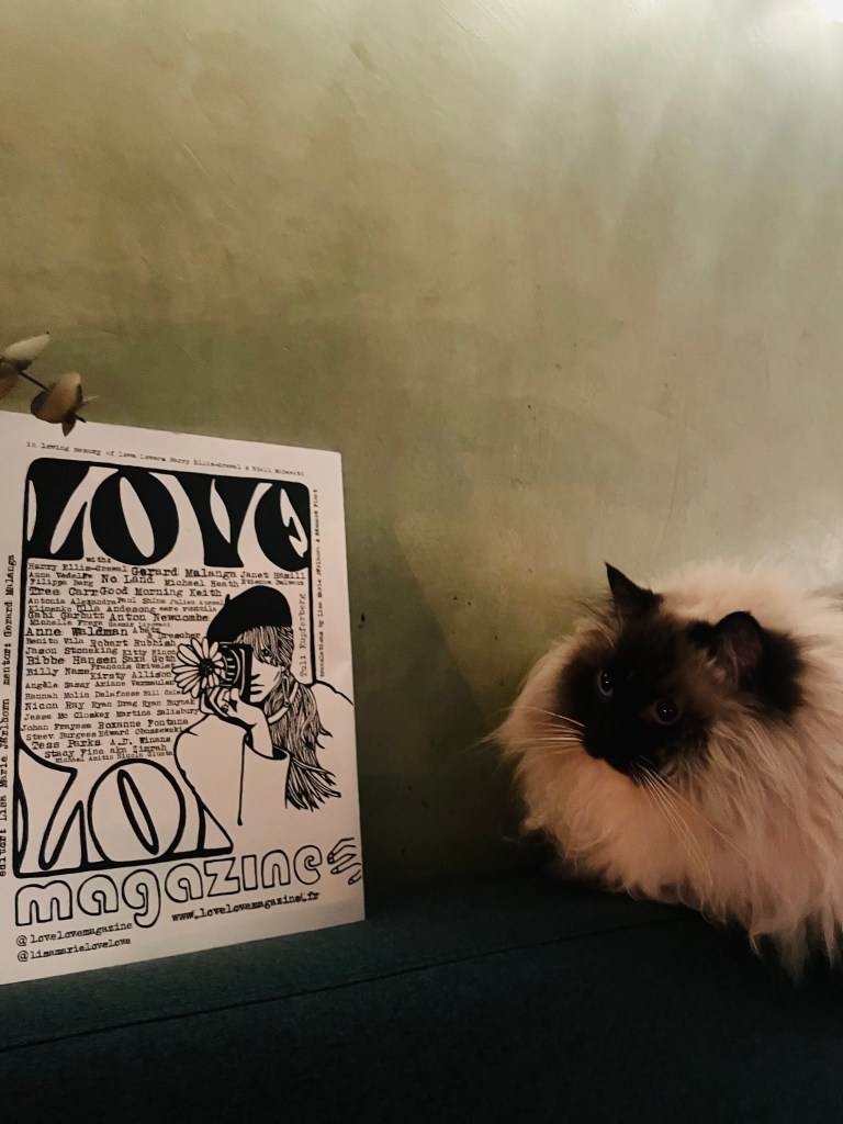 The latest publication of Love Love press was a compilation of Love Love material in a pocket sized Love Love 2019-2022 paperback of 160 pages, released on August 27 2022. Love Love #6 – The Reflective Foto issue – was released on January 21st 2023 in collaboration with Agnès b. and her La Fab gallery in Paris. On stage were artists Bibbe Hansen (The Factory, Fluxus, mother of musical artist Beck), Gabi Garbutt (UK) & Paul Shine (UK). Tree Carr (death doula & tarot reader) read everyone’s fortune in tarot cards.