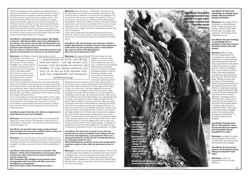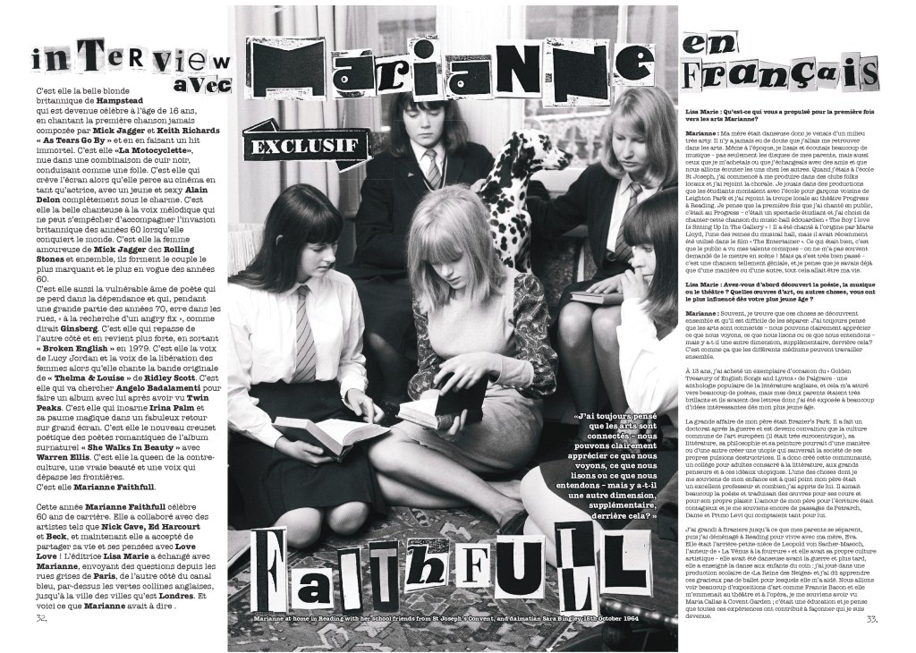 Every month Love Love will dig in our archives to present you with work from/or interviews with our Love Lovers that have been previously published in the paper magazine. Or new unedited work! For our very first Love Lover of the month of December we have chosen to share the interview with Marianne Faithfull in Love Love #7 – The Psychedelic Animal issue – for sale on our shop here.