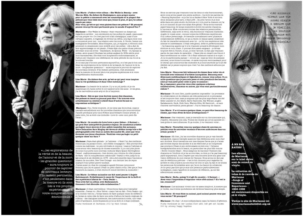 Cette année Marianne Faithfull célèbre 60 ans de carrière. Elle a collaboré avec des artistes tels que Nick Cave, Ed Harcourt et Beck, et maintenant elle a accepté de partager sa vie et ses pensées avec Love Love ! L’éditrice Lisa Marie a échangé avec Marianne, envoyant des questions depuis les rues grises de Paris, de l’autre côté du canal bleu, par-dessus les vertes collines anglaises, jusqu’à la ville des villes qu’est Londres. Et voici ce que Marianne avait à dire.