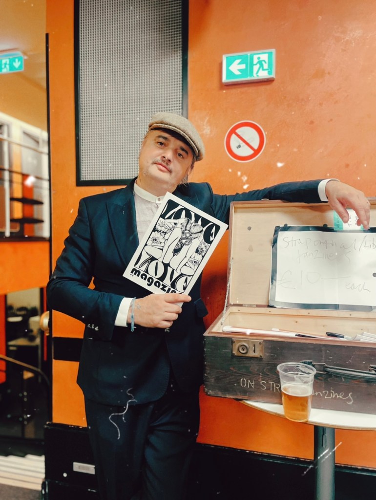Inside is rockstar & poet Peter Doherty. Peter is talking to a few people before me, then he comes out to have a look at the magazine and to say hello. He is wearing rain boots. It’s getting kind of chilly outside now as the sun goes down. Peter has a rustic, rainproof coat on. He looks very countryside. Perhaps it’s the living in Normandy, because that’s where he’s been spending his time lately.
