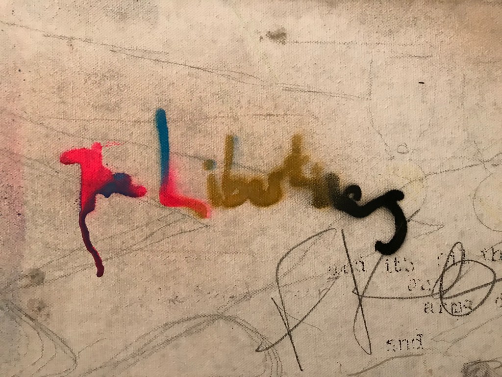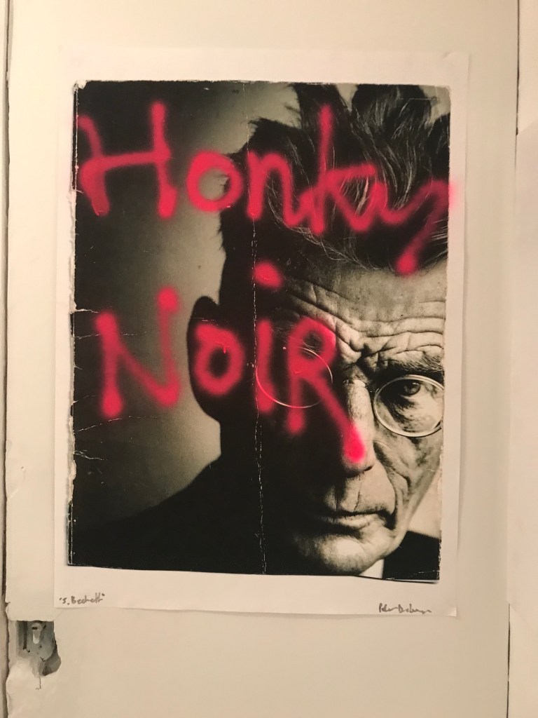 LM: It’s what you’ve written on Samuel Beckett (in pink neon spray paint on one of the artworks of the exhibition)