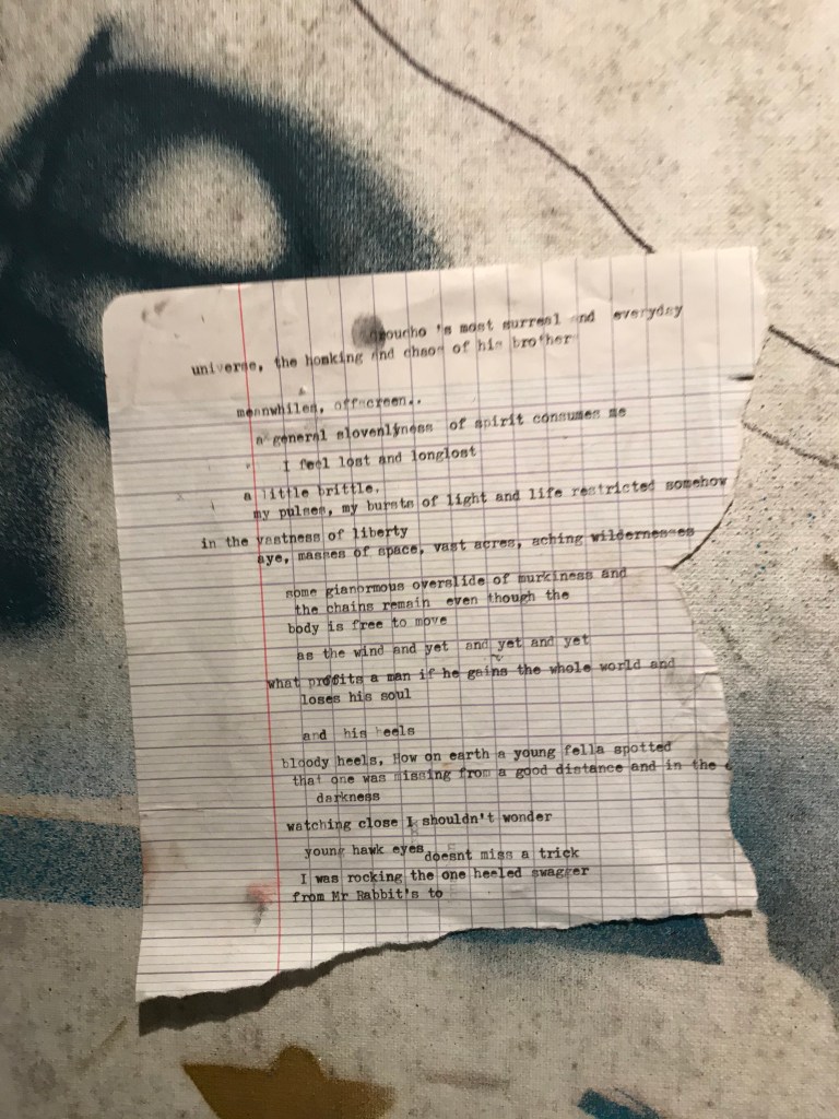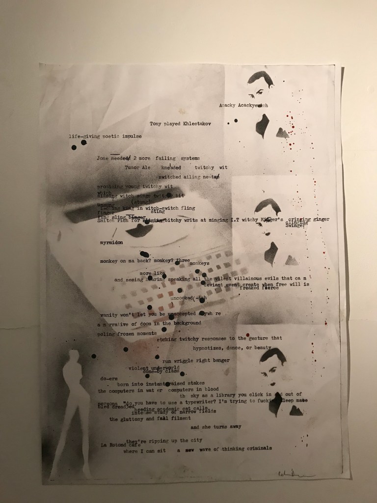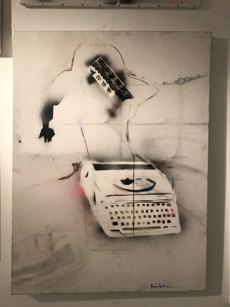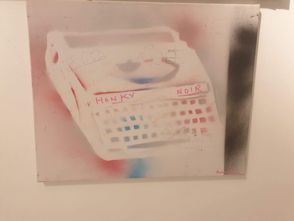 Peter is drinking a beer. We’re walking around his exhibition together. It’s still a bit messy, but the artworks fill the space well. The colour white is dominant, then there is the neon pink, the yellows, the greens, the quick graffiti spray expression…Stencil typewriters and typed lyrics pop up everywhere, rapid pencil drawings, outlines of faces and forms. Someone says there is blood on one of the paintings. I try to find it later, but forget to ask Peter about it. He points out Nico to me in one of them, another one is a self-portrait, one has the image of The Man with the Golden Arm on it, they are all little stories bound together. On top of Samuel Beckett’s face Peter has spray-painted ‘Honky Noir’, this is his own label of his art, what he ‘tunes’ into, a kind of creative parallel reality…