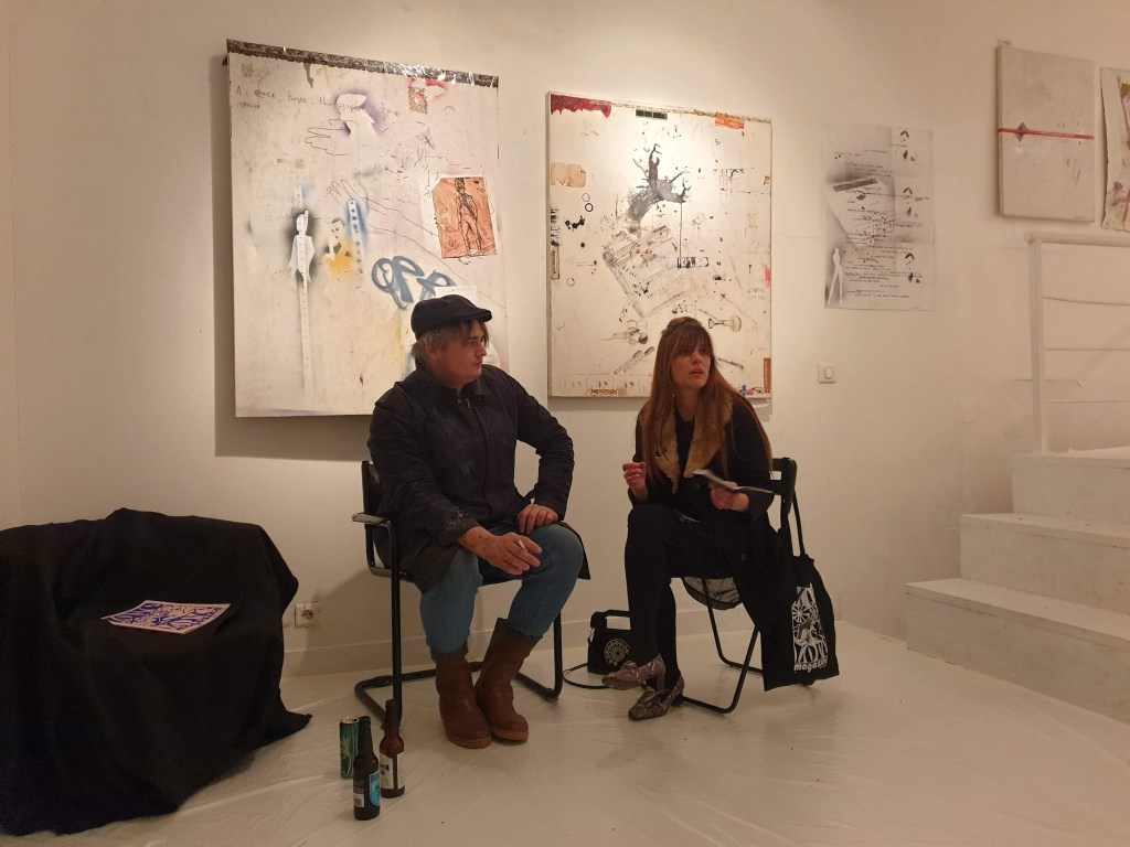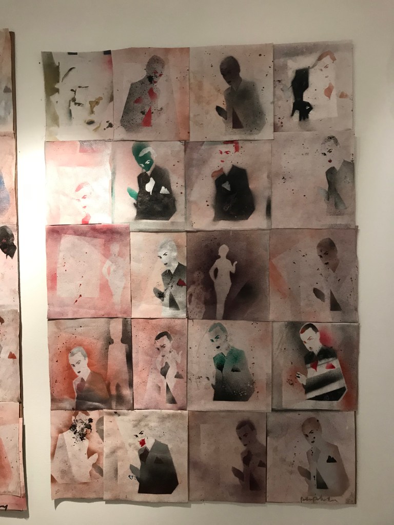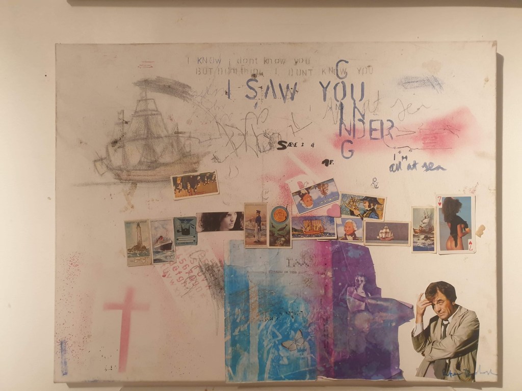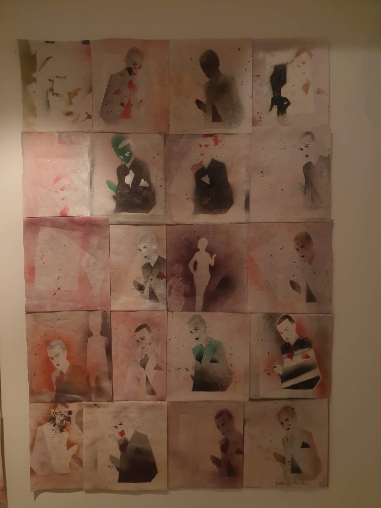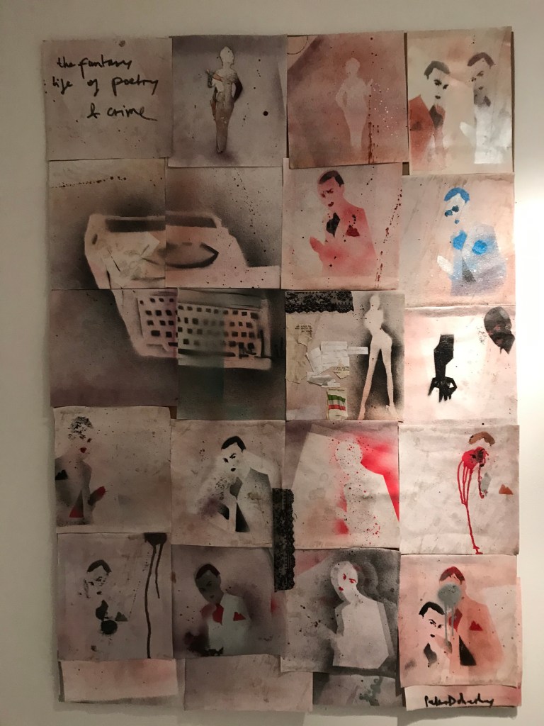 Peter is drinking a beer. We’re walking around his exhibition together. It’s still a bit messy, but the artworks fill the space well. The colour white is dominant, then there is the neon pink, the yellows, the greens, the quick graffiti spray expression…Stencil typewriters and typed lyrics pop up everywhere, rapid pencil drawings, outlines of faces and forms. Someone says there is blood on one of the paintings. I try to find it later, but forget to ask Peter about it. He points out Nico to me in one of them, another one is a self-portrait, one has the image of The Man with the Golden Arm on it, they are all little stories bound together. On top of Samuel Beckett’s face Peter has spray-painted ‘Honky Noir’, this is his own label of his art, what he ‘tunes’ into, a kind of creative parallel reality…