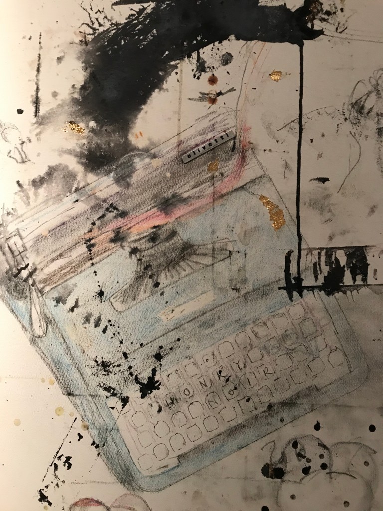 Now we’re in Montmartre, Paris. At the foot of one of those steep, romantic steps is the Gallery Chappe with its silvery façade. This is where Peter is exhibiting what he’s been working on since the world closed down. It’s the day before the opening and the exhibition isn’t installed to perfection yet. It’s called «The Fantasy Life of Poetry and Crime» and it includes more than 30 of Peter’s recent paintings. We go inside. Many artworks are laying around, little sketches of Amy Winehouse catch my eye. I like all the typewritten poems on the paintings. And the stencil of Peter’s Olivetti typewriter. He seems to worship it, I get the feeling.