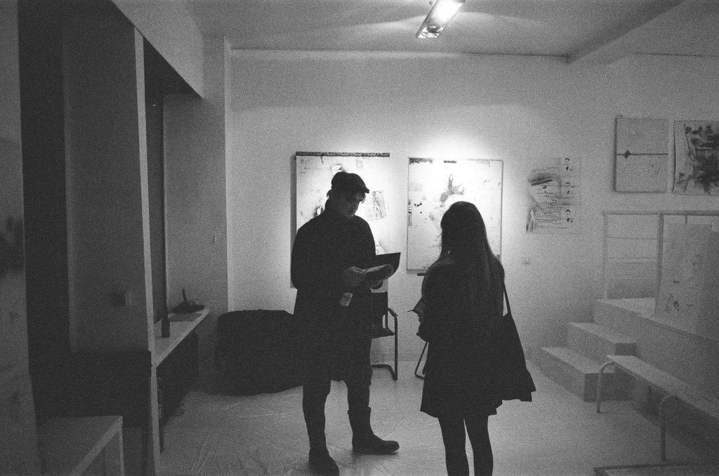 Peter and I get up and start walking around the exhibition, talking about Peter’s artworks.