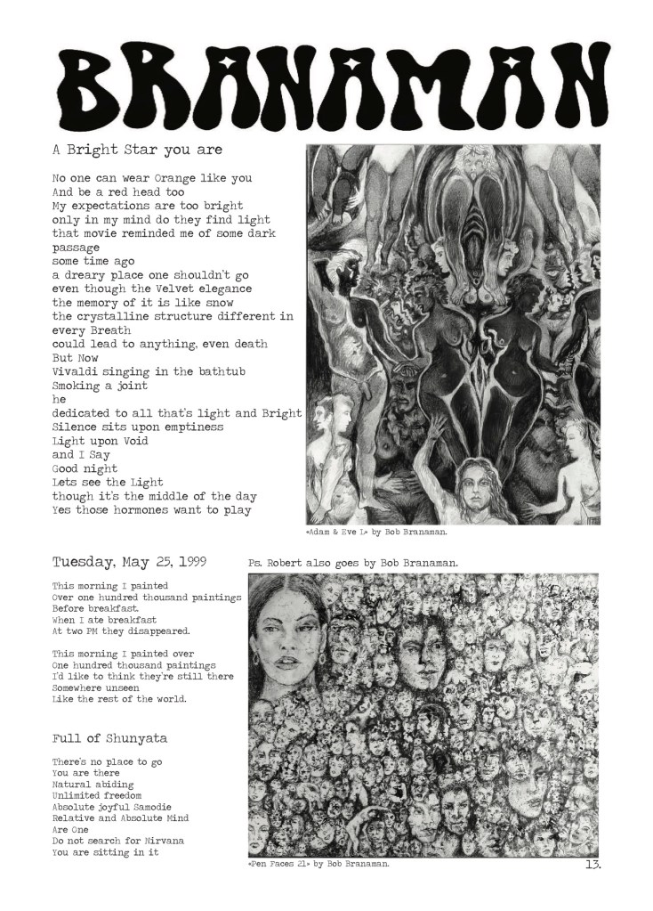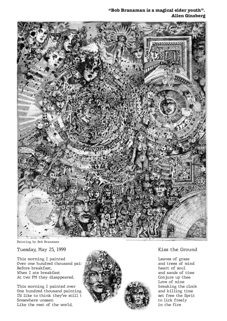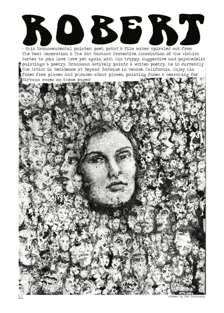 Robert “Bob” Branaman (1933-2024), a great beat artist, painter and poet, was one of the artists to believe in Love Love from the very beginning and contributed with some of his fabulous, intricate paintings as well as heartfelt and witty poems and cartoons since the very first issue of the magazine. He would later join Love Love for issues 2 and 7 and then sadly left us in 2024 when he passed away at the age of 90. This month Love Love honours Bob’s memory and his amazing art. Thank you Bob!