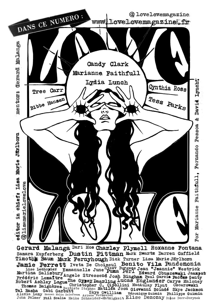 Love Love #9 with: Marianne Faithfull (posthume), Darren Coffield, Candy Clark (The Man Who Fell To Earth, American Graffiti), Lydia Lunch, Roxanne Fontana, Tess Parks, Gerard Malanga & Dustin Pittman (Warhol Factory) Pandemonia, Jamie Perrett (Babyshambles), Mark Fernyhough, Charles Plymell, Benito Vila, Roxanne Fontana, Tree Carr & many many more! Full list below.