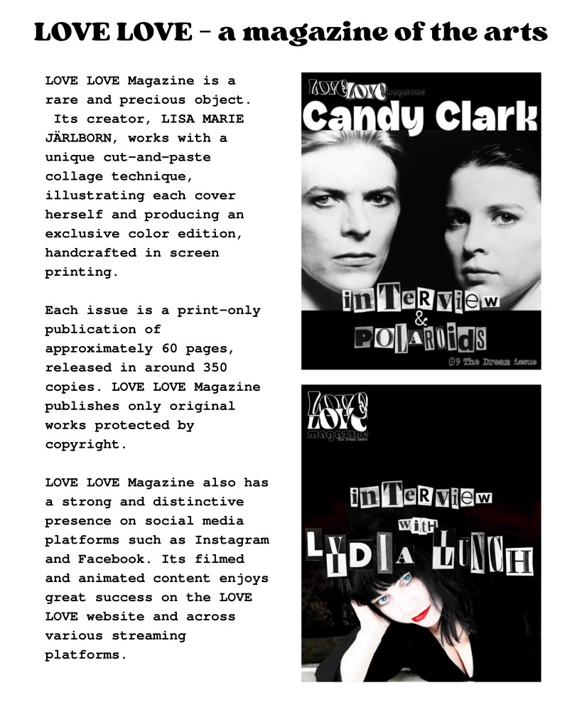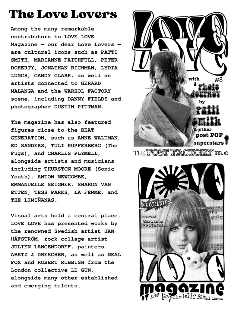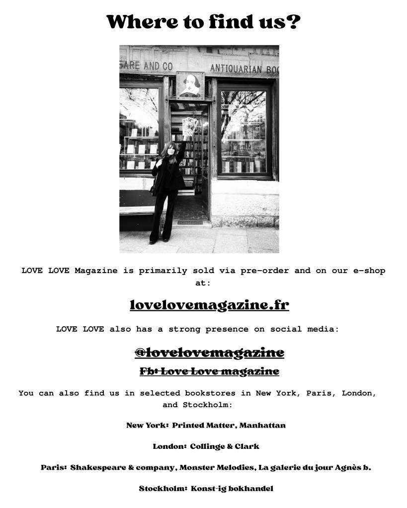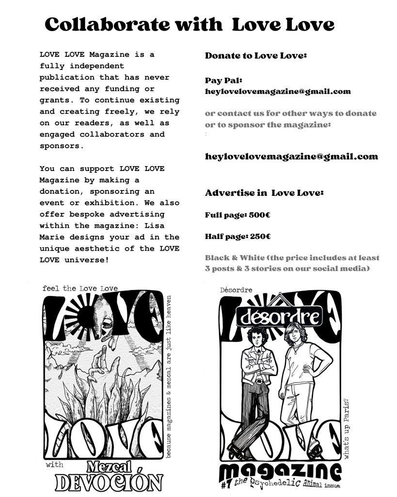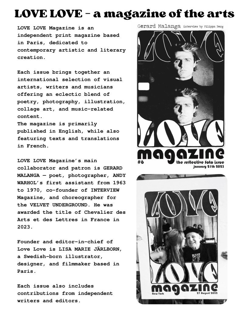 LOVE LOVE répondra à votre message si vous êtes accepté pour publication, au plus tard juste avant la date de publication. si vous n’avez pas été contacté, votre contribution n’a pas été acceptée. nous n’utiliserons pas votre contribution pour des numéros ultérieurs sans vous demander votre autorisation.